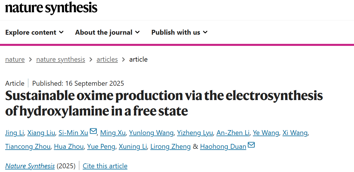 李敬特聘副研究员在可持续低碳催化技术领域取得新进展,相关成果以题为“Sustainable oxime production via the electrosynthesis of hydroxylamine in a free state”发表于《Nature Synthesis》。李敬特聘副研究员为论文第一作者,色情网