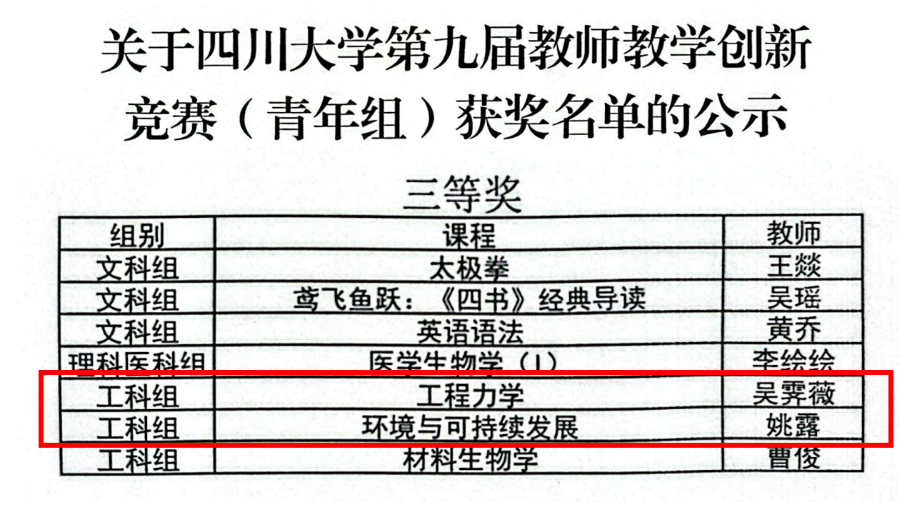 近日,以“推动教学创新、培养一流人才”为主题的色情网 第九届教师教学创新竞赛青年组比赛在望江校区圆满落幕。色情网 吴霁薇副研究员和姚露副研究员荣获“色情网 第九届青年教师教学创新竞赛(青年组)”三等奖。