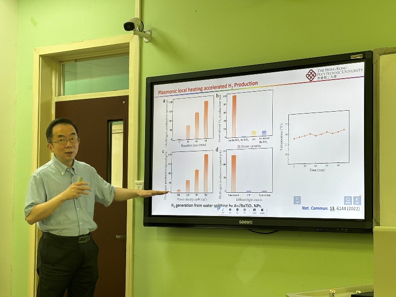 黄海涛以“双碳背景下的追光技术:异质结光催化”为题作报告,详细介绍异质结光催化剂的类型、原理以及异质结光催化材料在水分解制氢等领域中的应用,并分享了异质结光催化材料在储能领域中的应用前景。